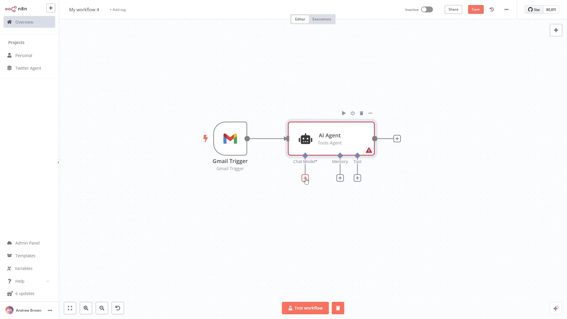 - AI 에이전트 노드 추가: 이제 이메일 내용을 분석하고 응답을 생성할 AI 에이전트 노드를 워크플로우에 연결합니다. 이 노드가 우리의 핵심 로직을 담당하게 됩니다.