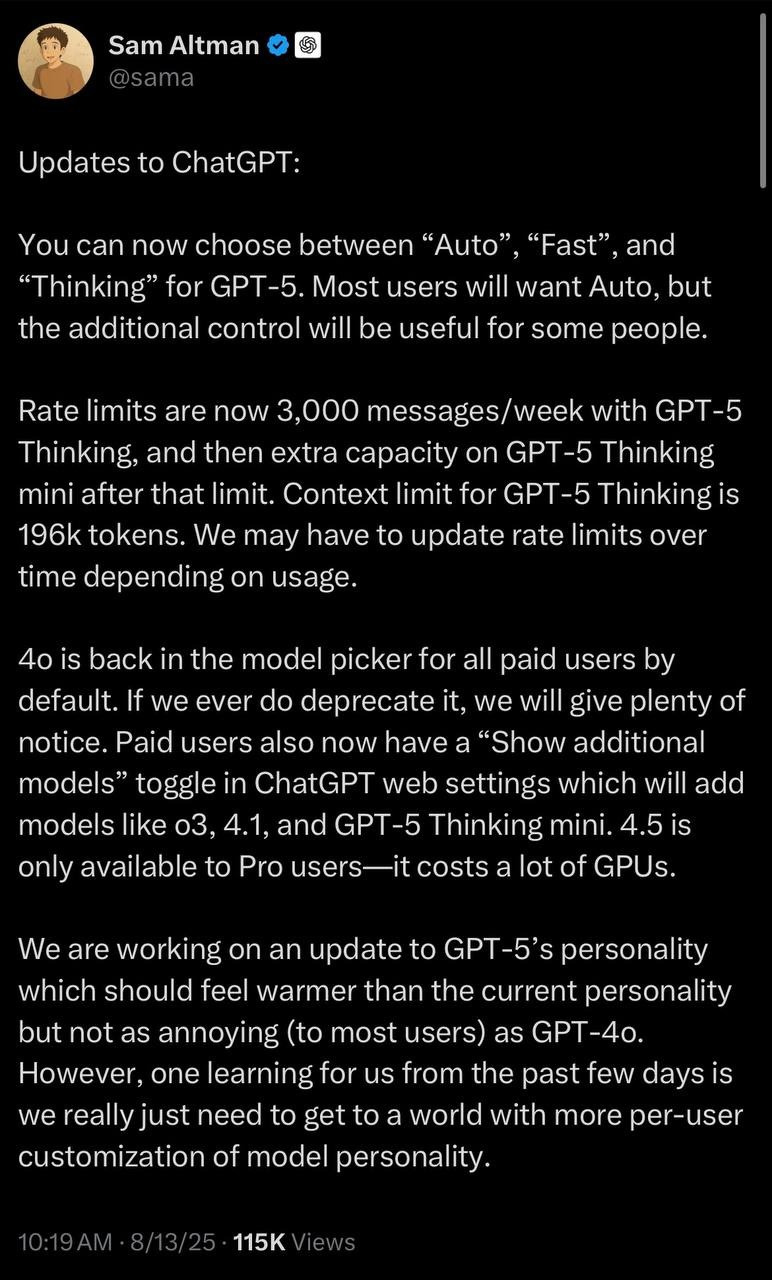 샘 올트먼 CEO는 공개 발언을 통해 GPT-5의 ‘성격(personality)’을 개선하고, 사용자별로 모델 성격을 맞춤화할 수 있는 방향을 확대하겠다고 밝혔다. 또한 모델 선택 단순화라는 제품 철학은 유지하되, 커뮤니티가 요구하는 과도기적 공존과 선택권을 병행하겠다는 입장을 시사했다.