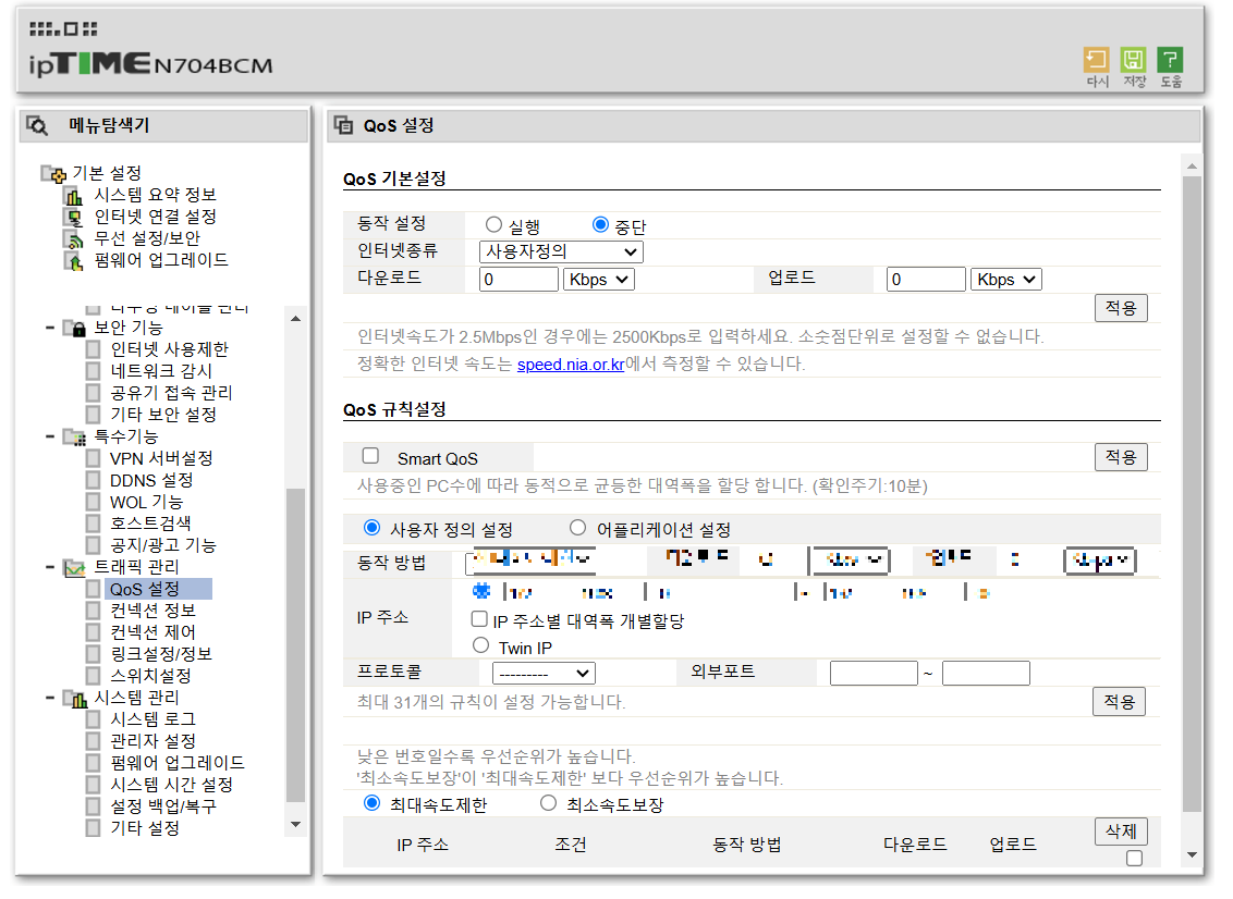 - 공유기 관리 페이지의 QoS 설정 메뉴로 이동합니다.