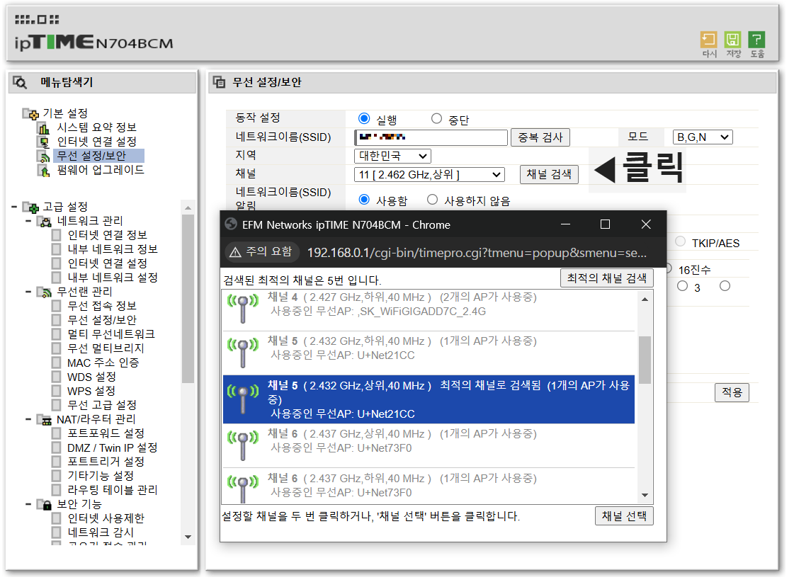 - * 수동으로 채널을 선택합니다. 2.4GHz 대역에서는 1, 6, 11번 채널이 권장됩니다.