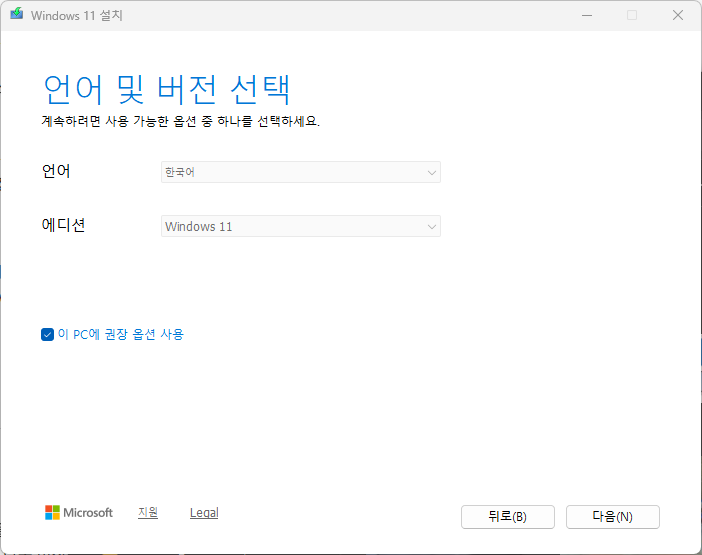 - 사용권 계약에 동의한 후, '이 PC에 권장 옵션 사용' 체크박스를 확인하고 [다음]을 누릅니다.